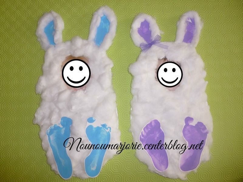 Les petits ont mis leurs pieds dans la peinture pour faire les pieds du lapin puis ils ont collé du coton sur un gabarit en carton. Nous avons ensuite collé une photo de leur visage pour finaliser.